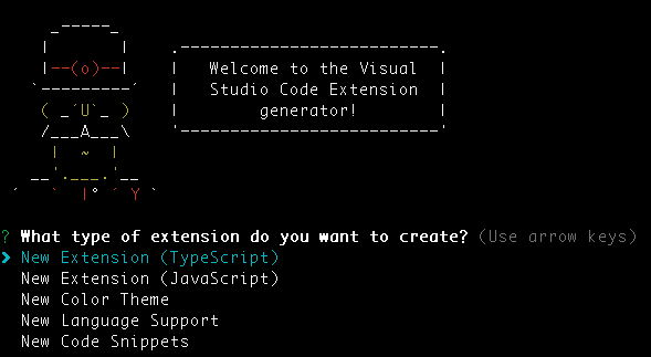 Yeoman VS Code Extension generator というプロジェクトフォルダ、雛形を生成するツールです。 https://code.visualstudio.com/docs/extensions/example-hello-world